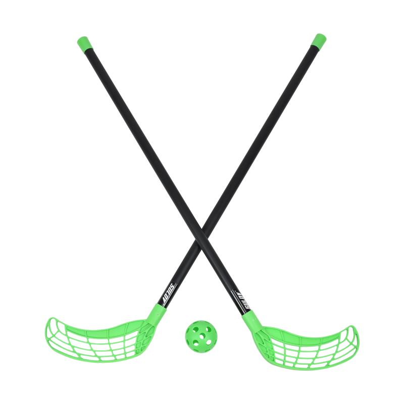 Florbalový set obsahuje dvě hole s plastovou žerdí a jeden hrací míček.