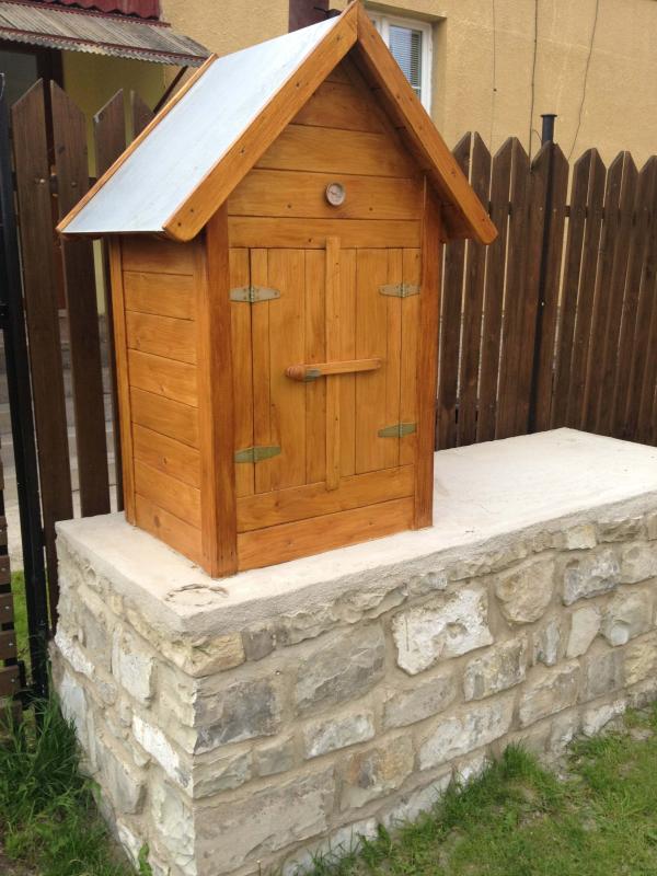 JEDEN DÍL UDÍRNY MÍRNĚ POŠKOZEN, VIZ FOTO. Domácí udírna na maso a uzeniny - zahradní venkovní udírna dřevěná ze smrkových palubek 19 mm silných. Uvnitř udírny jsou dřevěné podpěry na zavěšení masa.