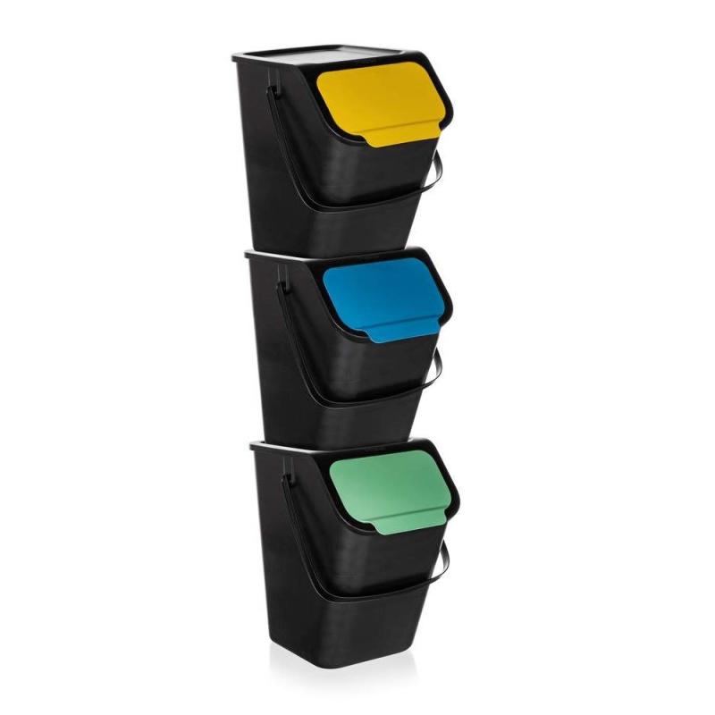 Sada košů vám usnadní třídění odpadu. Víko každého z nich má jinou barvu – zelenou, žlutou a modrou. Lehce je rozlišíte a snáze si zapamatujete, co do kterého koše patří. Jeden využijete na vyhazování plastu, druhý na papír a třetí na sklo. Koš navíc můžete používat i s pytlem na odpadky o objemu 60 l.Specifikace