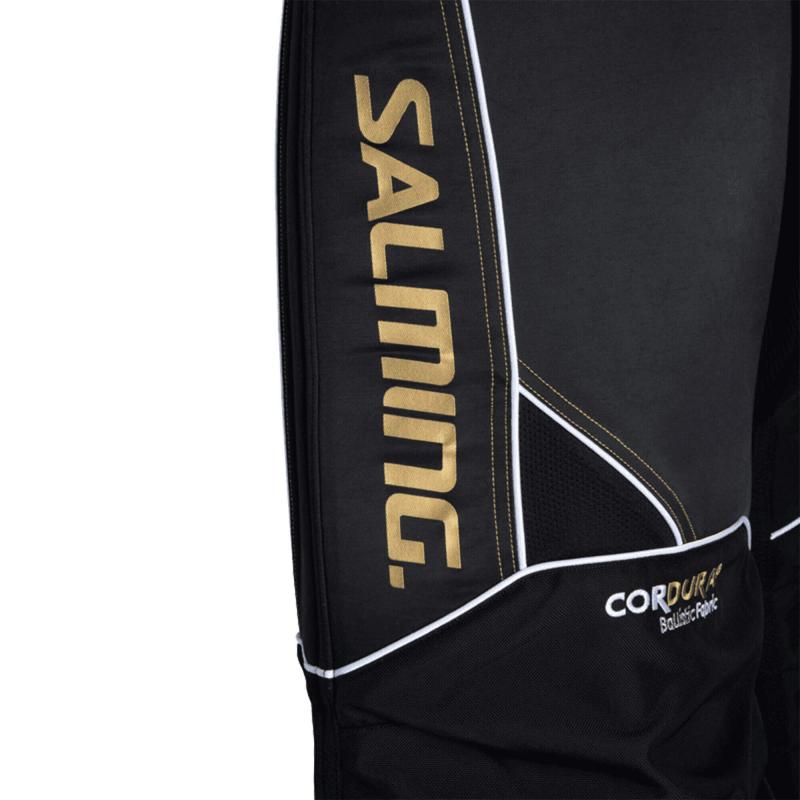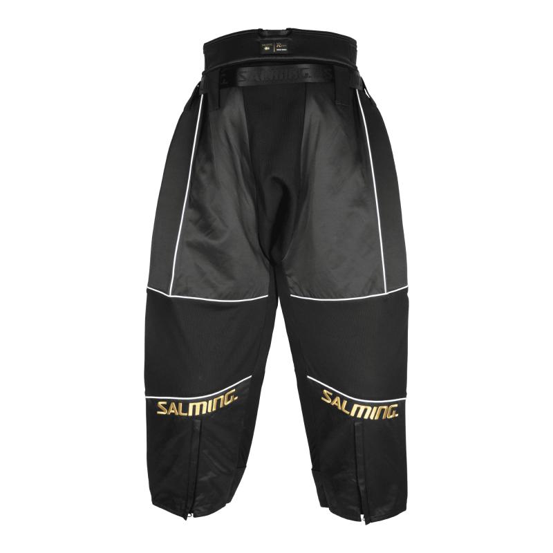 Brankářské kalhoty pro florbalové brankáře od značky Salming, řada React, široký střih, kolena z materiálu Cordura, tlumící materiál na přední straně stehen, kvalitní YKK zipy na nohavicích, černo-zlatá varianta Zobrazit celý popis