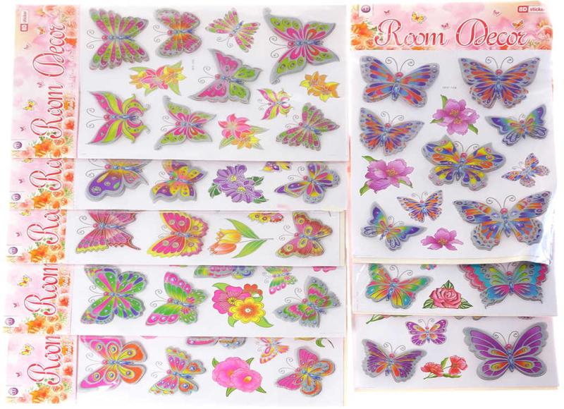 Krásné samolepky motýlci a květiny s 3D efektem, se třpytivými detaily. Nalepovací dekorace na stěnu v několika variantách provedení. Baleno po 1 archu, v sáčku.Rozměry balení (š v): 31 x 50cm