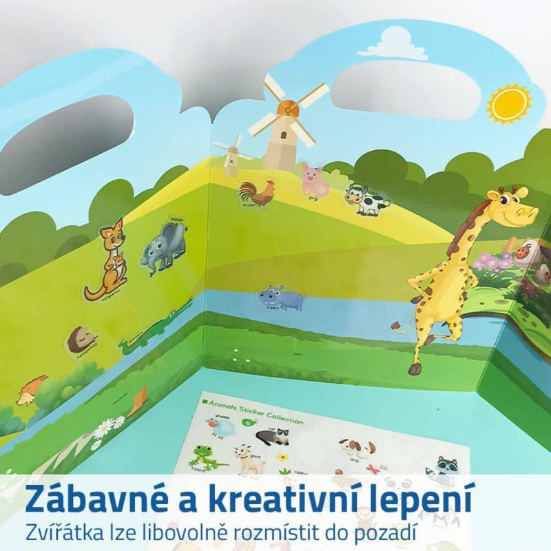 Naučte děti názvy zvířátek zábavnou formou. Kniha obsahuje mnoho samolepek různých zvířecích druhů. Ty je možné libovolně lepit do tématického pozadí, které se nachází uvnitř knihy. Samolepky neobsahují lepidlo. Pouze přilnou k papíru. Lze je tedy opět sejmout a nalepit na jiné vybrané místo. Lepení zvířátek do krajiny napomáhá rozvíjet jemnou motoriku, ale také představivost a kreativitu. Knížečku se samolepky snadno zabalíte s sebou na cesty. Díky úchytu se snadno přenáší.