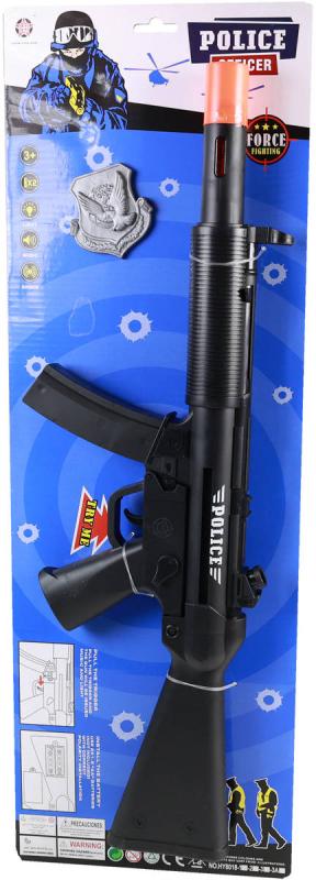 Černý plastový policejní samopal o délce 53cm v sadě s odznakem, pro všechny malé strážce zákona. Hračka na baterie, se světlem a zvukem.