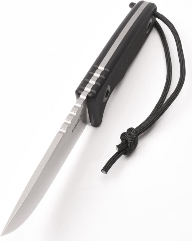 Horný okraj čepele s hrúbkou 4 mm je opatrený efektívnym hrubým vroubkovaním, ktoré zabraňuje sklznutiu palca počas práce, a to aj vo vlhkom prostredí alebo pri nosení rukavíc. Toto vroubkovanie zároveň uľahčuje zapálenie ohňa pomocou firesteelu – stačí prejsť vroubkovanou hranou o firesteel.