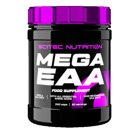 Scitec Nutrition Mega EAA je komplex důležitých esenciálních aminokyselin v nejideálnějším poměru, který doporučuje Světová zdravotnická organizace (WHO). Příjem esenciálních aminokyselin je podmíněn kvalitní stravou s obsahem bílkovin. Pro lidský organismus jsou nezbytné, jelikož si je tělo nedokáže samy syntetizovat (vytvářet). Mega EAA zajišťuje snadné doplňování aminokyselin v optimálním poměru ať už před nebo po tréninku. Na jednu dávku obsahuje až 3200 mg esenciálních aminokyselin.