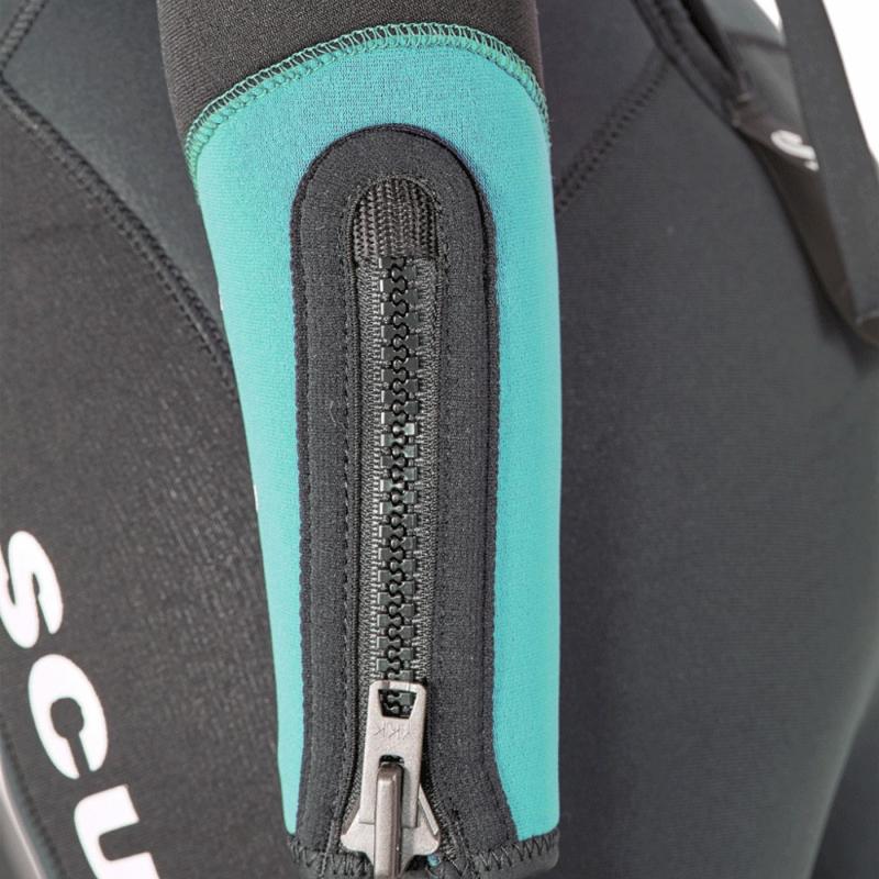 Nechýba ani odieruvzdorná tkanina na ramenách, pozadí a kolenách chrániaca pred trením potápačskej výbavy alebo pri sedení či kľaknutí.