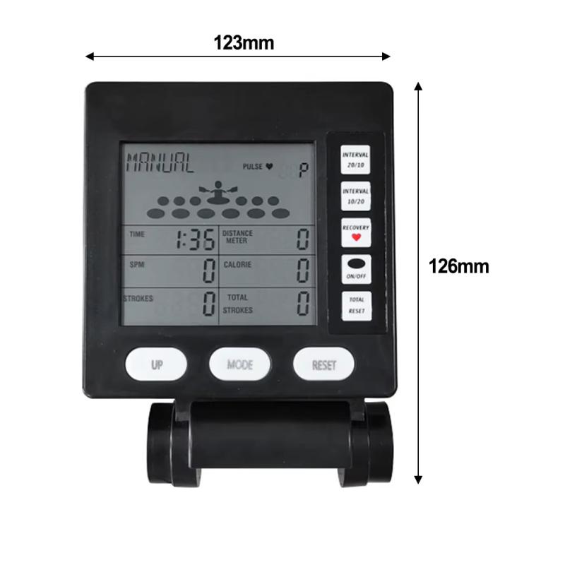 - Přehledný LCD monitor – zobrazuje čas, vzdálenost, počet záběrů, spálené kalorie a umožňuje nastavení intervalových programů (20/10, 10/20).