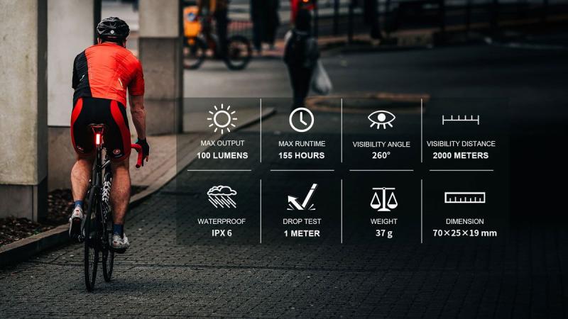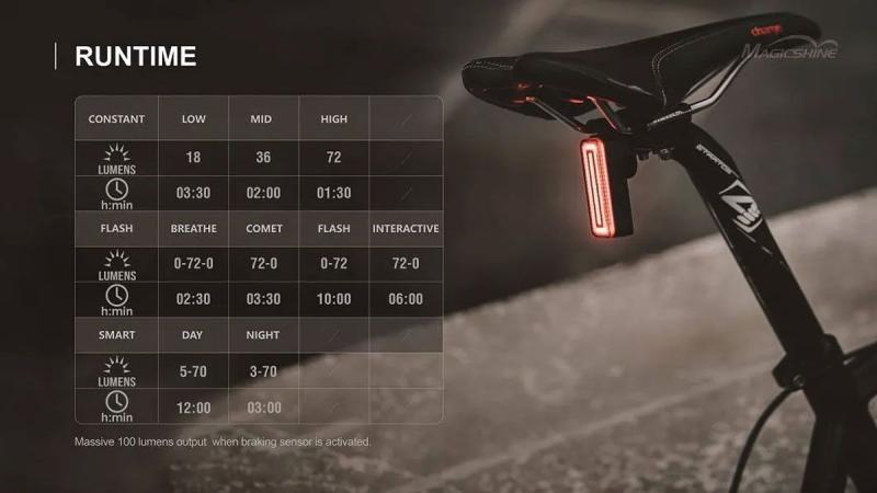Inteligentní snímač pohybu se automaticky aktivuje při brzdění a rozsvítí světlo s maximální intenzitou 100 lm na 3 sekundy. Vestavěný senzor také automaticky mění režim svícení podle venkovního prostředí, čímž zvyšuje účinnost světla.