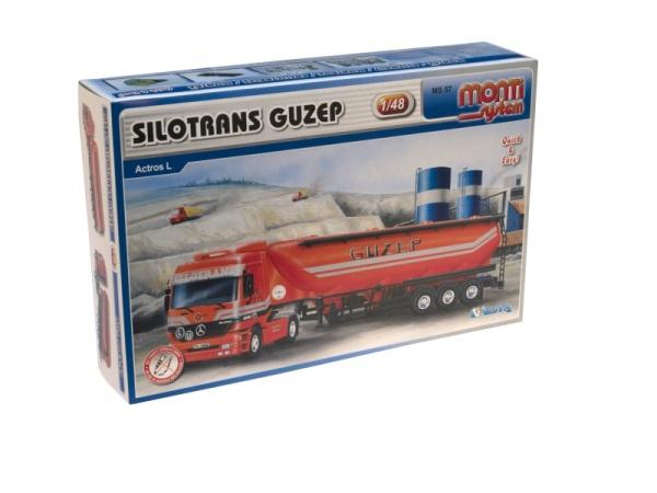 Model Monti System MS č.57 - Silotrans GUZEP je tahač Mercedes-Benz Actros s návěsem firmy Guzep. Mercedes Actros Monti System MS 57 v měřítku 1:48 patří do řady modelů Monti System PROFI, tedy mezi nejsložitější stavebnice s velkým počtem dílů.