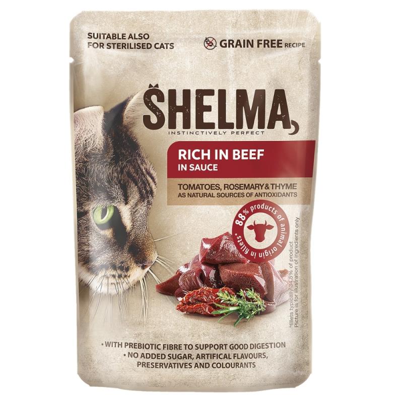 SHELMA Cat hovězí s rajčaty a bylinkami v omáčce, kapsa 85 g (bal. 28 ks)