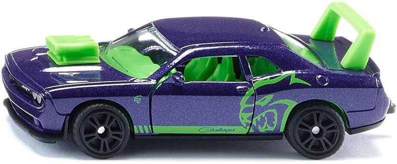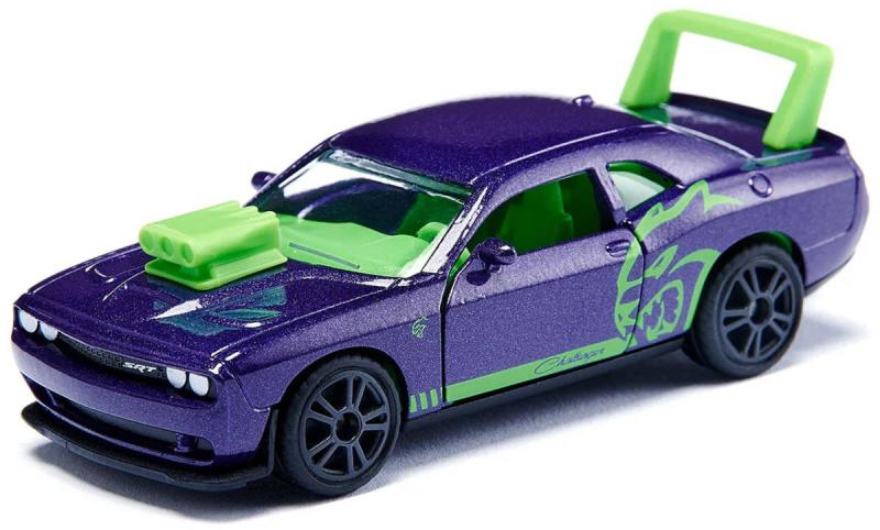 SIKU 1572Model sportovního automobilu Dodge Challenger Hellcat Custom. Samotný propracovaný lak je vrcholem sám o sobě: originální lila barva Dodge Plum Crazy je v oslnivém kontrastu s oslnivou zelenou na obrovském zadním spoileru, efektním ventilátoru na kapotě a interiéru. Grafika na bocích a černé sportovní ráfky s pogumovanými pneumatikami ... splněný sen o vysoké rychlosti! Tělo této hračky je vyrobeno z robustního kovu a podvozek a interiér jsou vyrobeny z lehkého plastu. To znamená, že Dodge si snadno poradí s těmi nejúžasnějšími kousky na závodních tratích. Dvoje velkorysé dveře a čiré prosklení odhalují očím věrnou reprodukci interiéru vozu. Tento model Dodge odpovídá svému velkému bratrovi do nejmenších detailů.