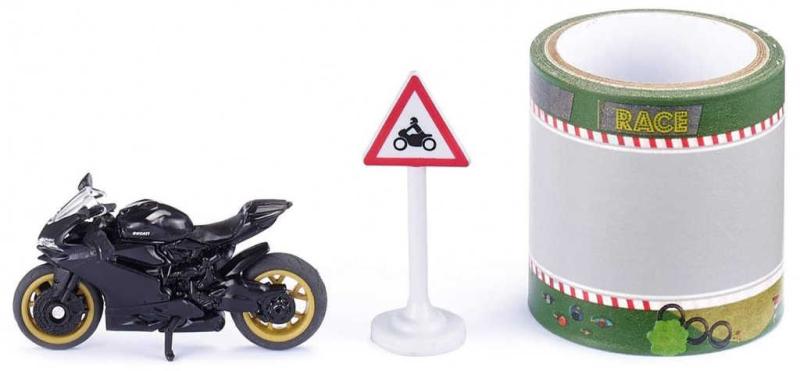 SIKU 1601 - Herní set s motocyklem Ducati Panigale 1299, dopravní značkou a rolovací dráhou.Motorka Ducati Panigale 1299 je provedena v matně černé barvě a zlatými koly. Rozbalte závodní dráhu, která je součástí balení (cca 5 m), přilepte ji na hladký čistý povrch nebo koberec s nízkých