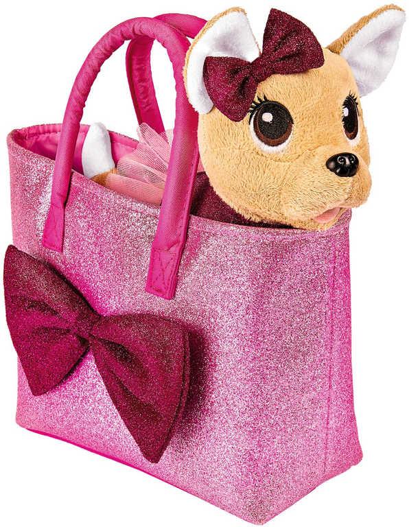 Plyšový pejsek čivava s mašlí v růžovém třpytivém oblečku s taškou s mašlí.