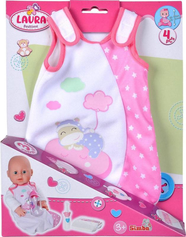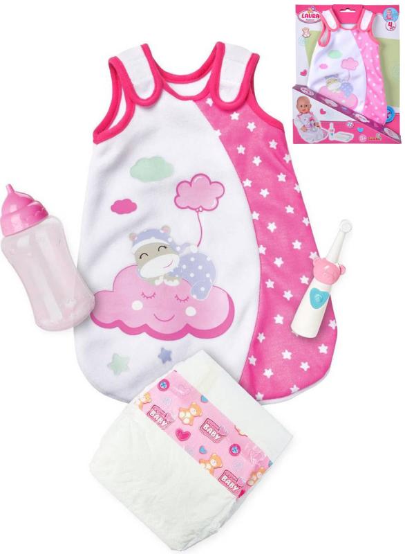 Kojenecká sada na spaní obsahující spací pytel, zubní kartáček, plenku a lahvičku - doplněk pro panenku - miminko Lauru o velikosti 30-38cm.S herním setem Laura Good Night můžete svou panenku uložit do postele a připravit ji na klidný spánek. Před spaním se napije z lahvičky a poté si zuby vyčistí zubním kartáčkem. Po výměně plíny může vaše panenka vklouznout do spacího pytle s roztomilým motivem zvířátek.