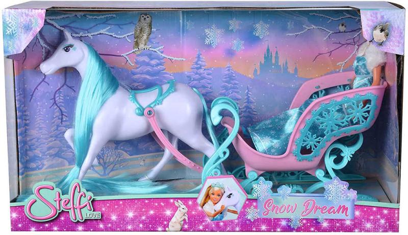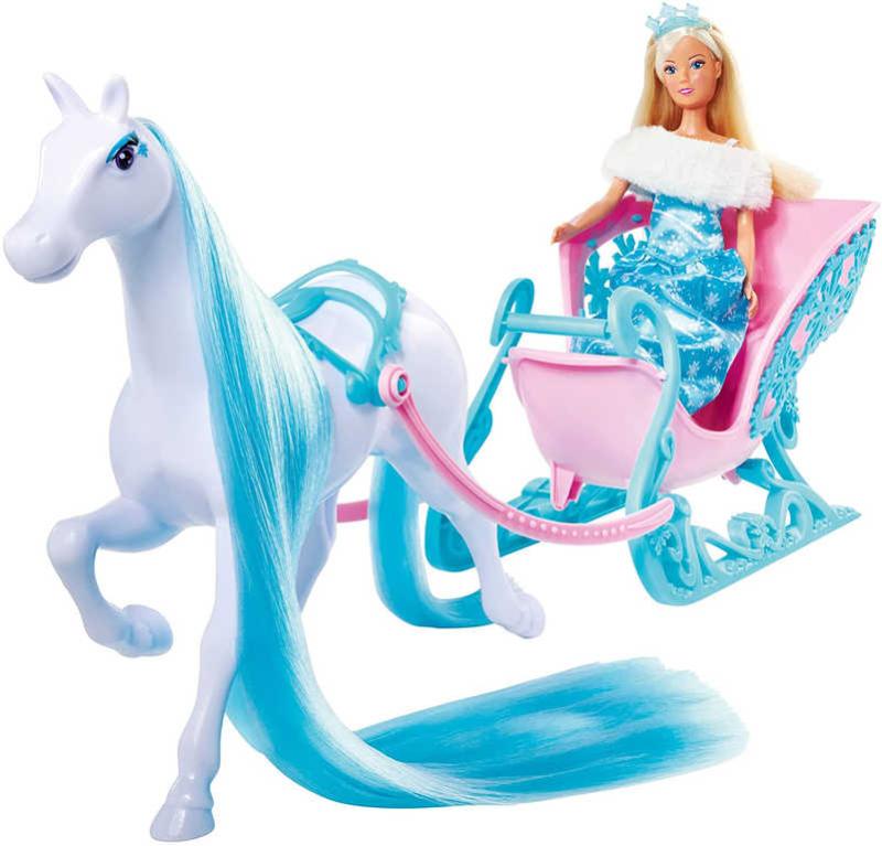 Panenka Steffi jako ledová zimní princezna, v setu s koněm a kouzelnými zimními saněmi. Bílý koník má krásnou dlouhou hřívu, kterou můžeš česat. Baleno v krabici.Panenky zaručeně potěší naprostou většinu malých holčiček. Kterou holčičku by nebavila hra s panenkami? Převlékání, sehrávání scének nebo aranžování domečku pro panenky je přeci zábava! Panenka je dárek,