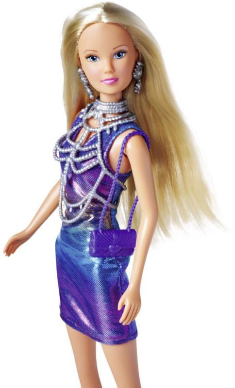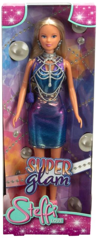 Panenka Steffi Love Super Glam s krátkými třpytivými šaty a modními doplňky (kabelka, náušnice, náhrdelník). Velikost panenky 29cm.Oblékací panenka Steffi Love je skutečná módní panenka. Miluje elegantní oblečení, módní účesy, svou malou sestru Evičku a samozřejmě svého přítele Kevina. Holčičky mohou svou panenku stylizovat a oblékat do nejnovějších módních trendů.