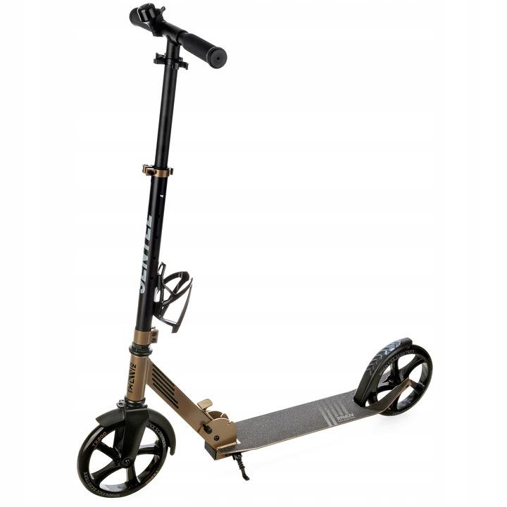 Skládací koloběžka RAVEN Sentel Gold 200 mm se zvonkem a košíkem na láhev. Skládací koloběžky RAVEN s kolečky o průměru 200 mm se doporučují dospělým i dětem od výšky přibližně 115 cm (děti od 5 let) do výšky 180 cm.