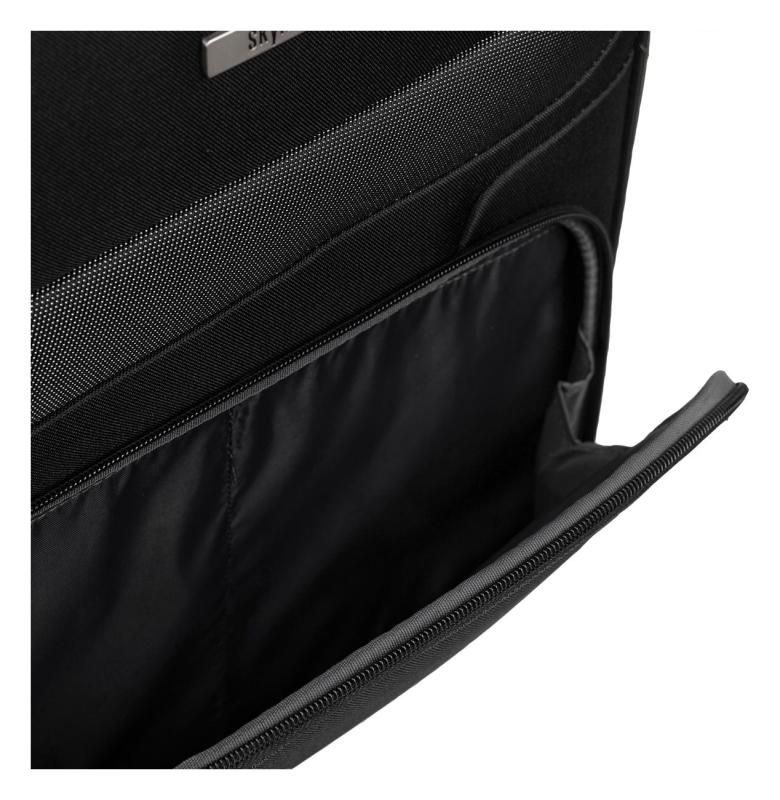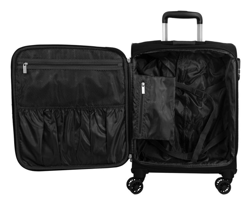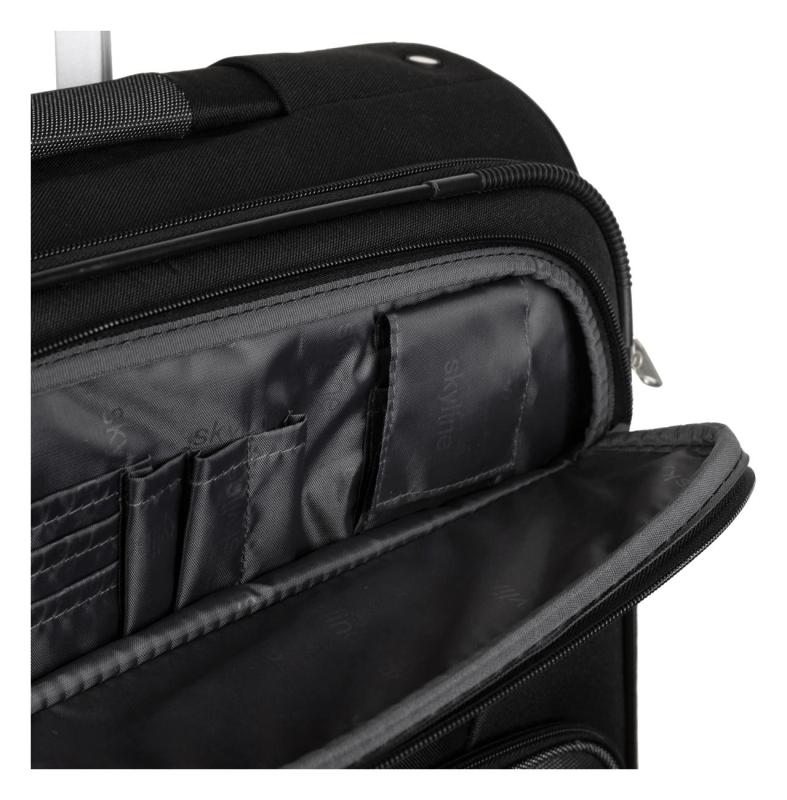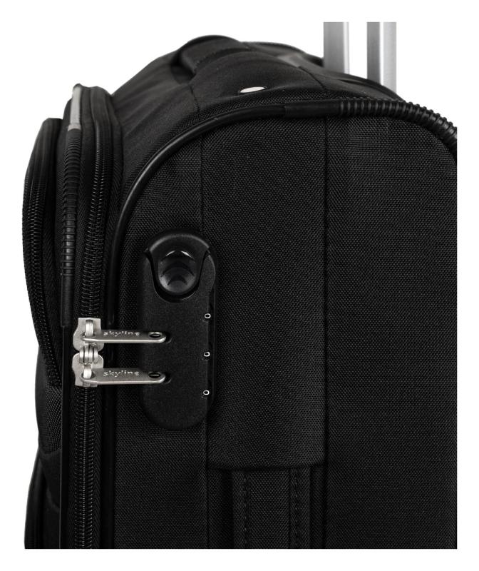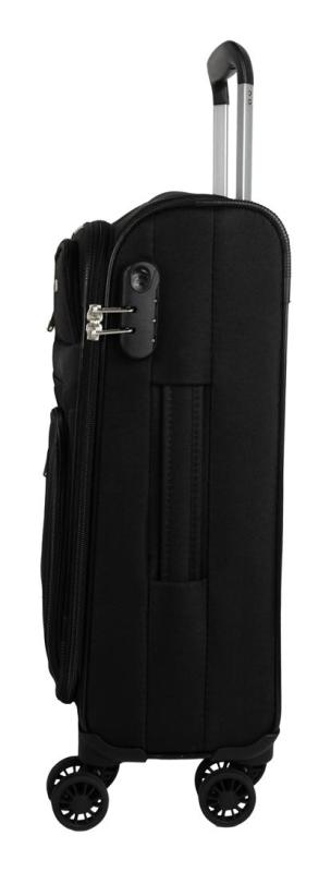 Univerzálny štvorkolieskový textilný kabínový kufor s integrovaným kombinačným zámkom, menovkou a dvoma prednými vreckami.4 kolieska otočné o 360°