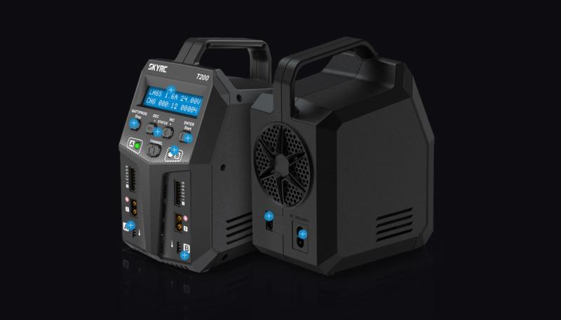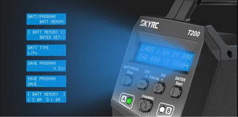 Nabíječka SkyRC T200 má nejkompaktnější design, zabírá minimum místa, klíště dvojice baterií. Nabíječka dodává 100 W integrovaného výkonu prostřednictvím každého nabíjecího okruhu. Za vkusným pláštěm se skrývá dostatek výkonu pro nabíjení dvou baterií současně s proudem až 12 A na kanál, takže během okamžiku napumpujete život do široké škály baterií, od přijímačových sad až po 6S lithium-polymerové nebo NiMH a NiCD 15S baterie. Nabíječ navíc poskytuje veškeré programovatelné funkce, které od moderního špičkového nabíječe očekáváte.