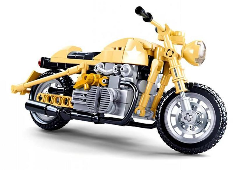 Armádní motorka ze sady Model Bricks pro milovníky starých motorek. Postav si stavebnici modelu armádní motorky. Tuto motorku sestavíš z 223 dílků podle tištěného návodu krok za krokem. Po sestavení je dlouhá téměř 17 cm.