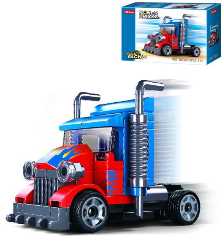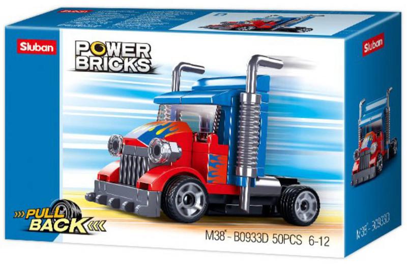 SLUBAN Model Bricks (M38-B0933D) Auto tahač s pohonem na zpětný chod. Kvalitní plastová stavebnice. Lze kombinovat s většinou ostatních známých stavebnic.Natahovací autíčko tahače v modro-červených barvách ze série stavebnic Sluban Power Bricks. Stavebnice obsahuje 50 dílků, nálepky a tištěný návod. Stavebnice Sluban pro malé i velké. Postav si svůj vlastní příběh!