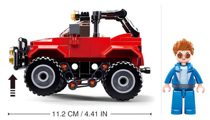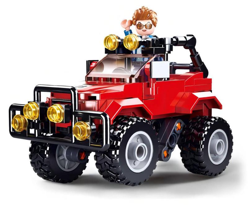 Stavebnice červeného SUV vozu s odpružením ze série Sluban Town. SUV je po sestavení dlouhé 11cm. Stavebnice obsahuje 135 dílků, jednu figurku, nálepky a tištěný návod. Stavebnice Sluban pro malé i velké. Postav si svůj vlastní příběh!