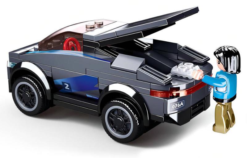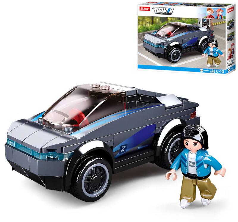 SLUBAN Town (M38-B0901) Elektrický sportovní vůz. Kvalitní plastová stavebnice. Lze kombinovat s většinou ostatních známých stavebnic. Součástí 1 figurka.Stavebnice moderního elektro-vozu ze série Sluban Town. Auto je po sestavení dlouhé 12cm. Stavebnice obsahuje 136 dílků, jednu figurku s kolečkovými bruslemi, nálepky a tištěný návod. Stavebnice Sluban pro malé i velké. Postav si svůj vlastní příběh!
