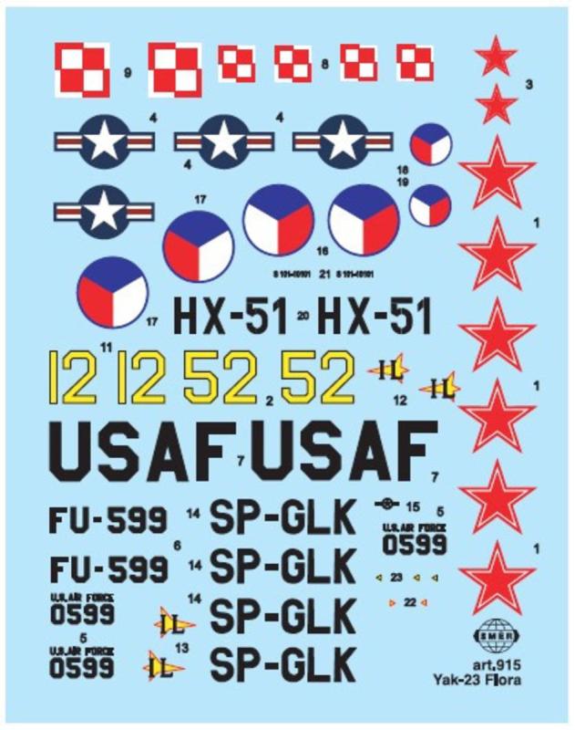 SMĚR 0915 - Sovětské vojenské bojové letadlo stíhačka Jakovlev Jak-23. Modelářská plastová stavebnice. Model letadla určený ke slepení. Kit obsahuje plastikové výlisky z původních forem podniku Kovozávody Prostějov.Jakovlev Jak-23 byl první sovětskou proudovou stíhačkou s rovným křídlem. Letoun byl vyvinut z typu Jak-17 koncem 40. let minulého století. Stroj poháněly sovětské kopie německých motorů typu Junkers JUMO 004B (typ RD-10) nebo BMW 003A (typ RD-20). Jak-23 se nemohl rovnat s výkonnějším a aerodynamicky pokročilejším typem MiG-15 se šípovitým křídlem, a tak počet vyrobených kusů byl jen omezený. Mnohé stroje Jak-23 byly vyváženy do zemí Varšavské smlouvy včetně Československa.