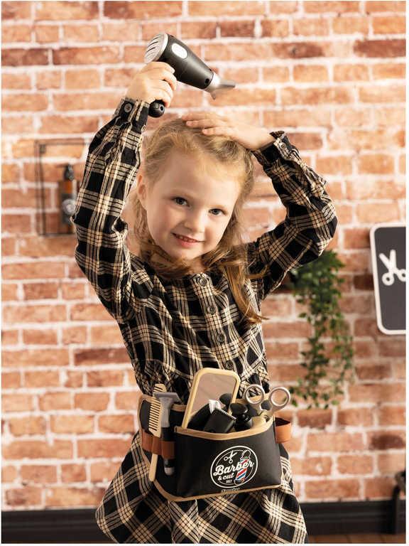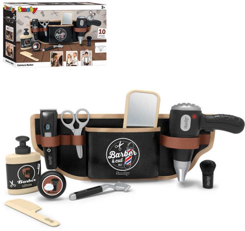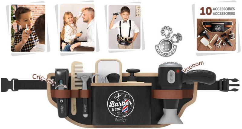 Nastavitelný dětský holičský pás s 10 doplňky. Hračka na baterie, se světlem a zvukem. Baleno v krabici.Textilní pásek s nastavitelnou velikostí lze perfektně nastavit a snadno se nasazuje pomocí klipu vhodného pro děti. Gumičky drží deset doplňků: nůžky, mechanický