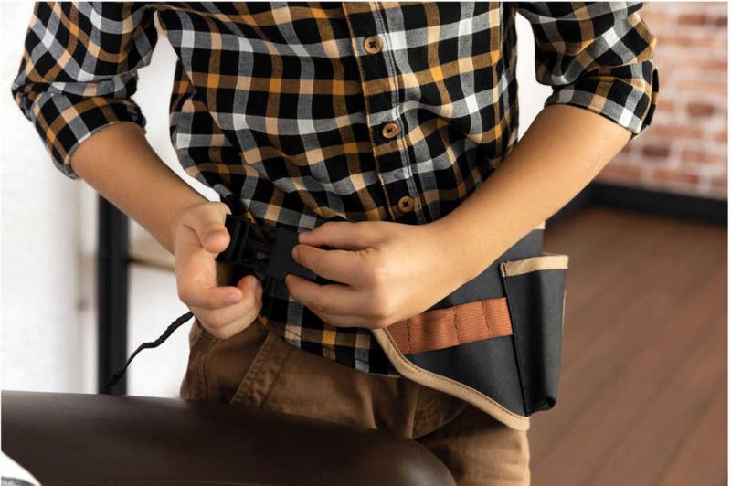 Textilní pásek s nastavitelnou velikostí lze perfektně nastavit a snadno se nasazuje pomocí klipu vhodného pro děti. Gumičky drží deset doplňků: nůžky, mechanický