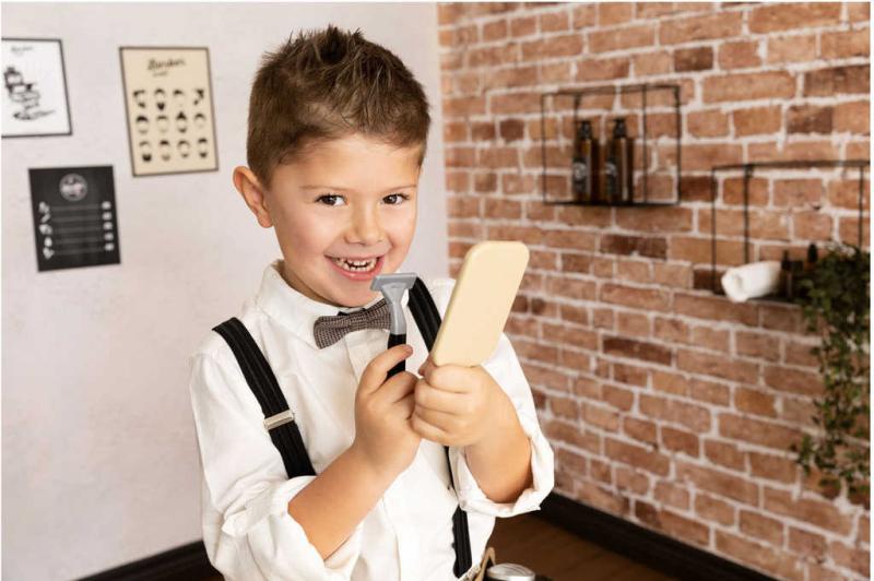 zastřihovač vousů, pleťová voda, holicí strojek, zrcátko, elektronický fén se zvukem, mýdlo na ruce, hřeben a štětka na holení. Krásná hračka pro všechny malé holiče a barbery.