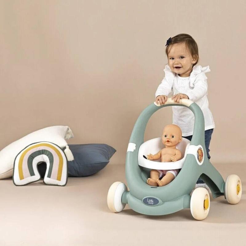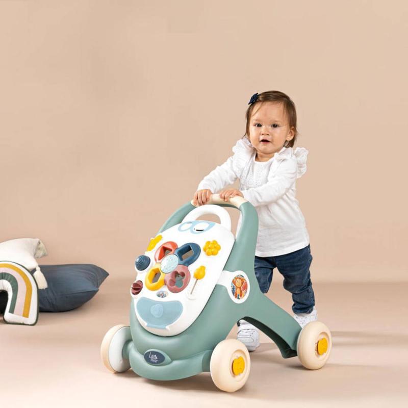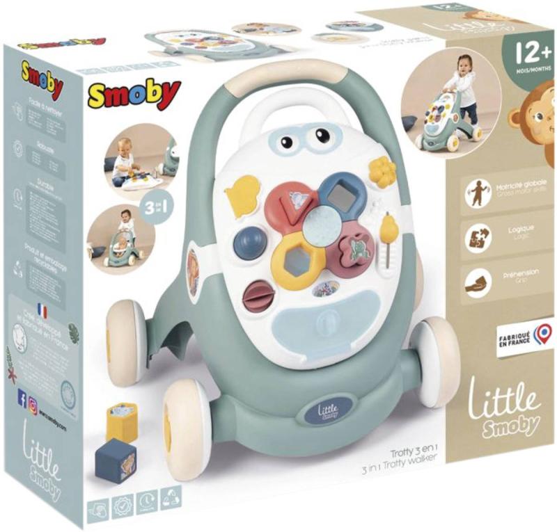 S chodítkem Little Smoby 3 v 1 lze bezpečně objevovat svět, a to jak motoricky, tak všemi smysly. Ergonomická rukojeť zajišťuje robustnímu chodítku bezpečnost při prvních krůčcích. Když se nepoužívá, lze aktivovat systém zamykání kol. V přední části je integrována hrací deska s různými učebními hrami, která podporuje motorické dovednosti. Ti nejmenší poznávají tvary a barvy a jak je správně přiřazovat. Na herní desce jsou také dvě rolovací očíčka, kterými může dítě otáčet, malá dvířka s klíčem na otevírání a zavírání, zrcadlová dvířka, otočná květina, malé otočné kolečko, posuvný brouček se zvukem "crick-crack" a klakson. Hrací desku lze používat i samostatně, lze ji sejmout a snadno přenášet díky rukojeti na horní straně. A jakmile se deska sundá, slouží chodítko i jako kočárek pro panenky, protože pod hrací deskou je sedátko, do kterého lze umístit oblíbenou panenku.