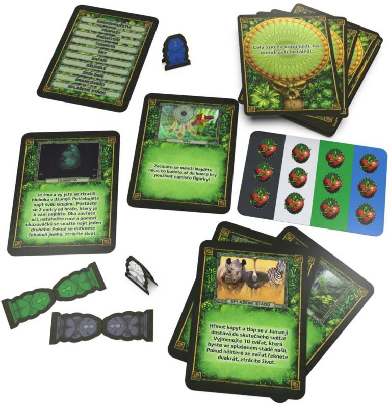 Obsah balení: 50 karet s výzvami, 1 karta na počítání životů, 1 karta s odpověďmi na hádanky, 1 vyloupávací list s postavami, 1 karta s pokyny