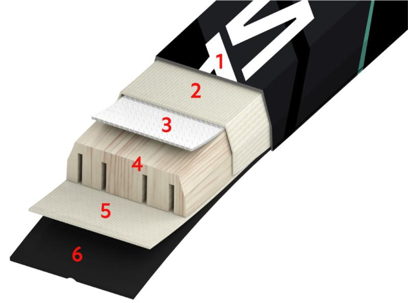 Stabilizované drevené jadro zložené z mnohých lamiel výberového dreva. Lyže vhodné na upravené trate.
