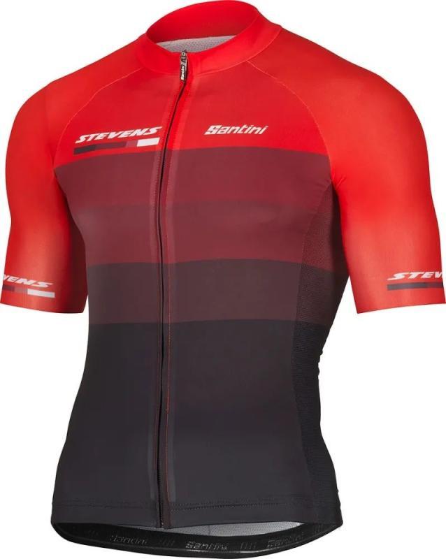 Celorozopínací cyklistický dres STEVENS raglánového strihu s krátkym rukávom z rady Equipe. - Mix materiálov PES/ELASTAN - 3 zadné vrecká + jedno menšie vrecko na zips - elastická silikónová manžeta - výrobca Santini.it