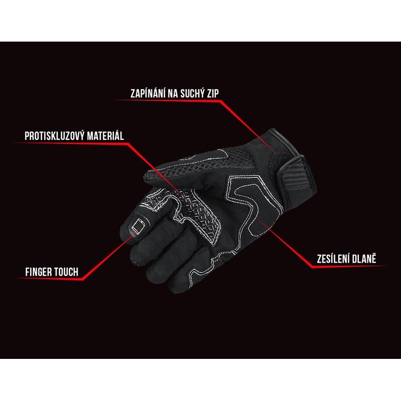 Bezpečnost zvyšuje CE chránič kloubů podle normy EN 13594:2015 - level 1, který účinně chrání ruce při případném nárazu. Dlaň je zesílená a opatřená protiskluzovou úpravou, což zlepšuje pevný úchop řídítek a přispívá k lepší kontrole nad motorkou.