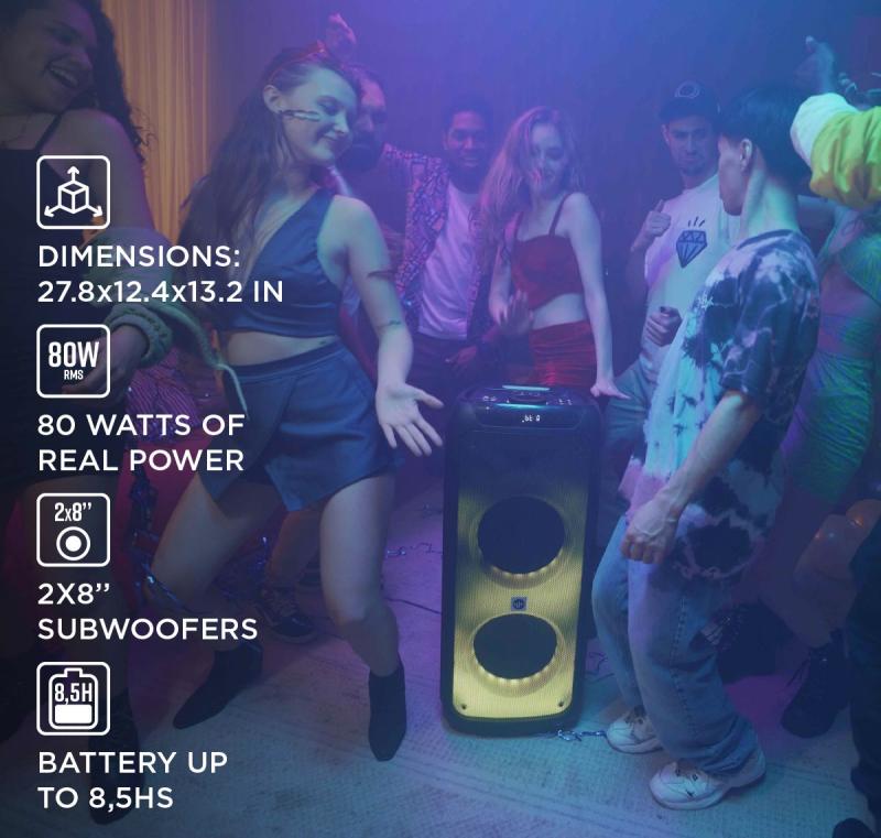 Stromberg TONE-2 – výkonný Bluetooth reproduktor, který rozzáří každou akci. S RGB LED podsvícením, výkonem 80 W a mikrofonem v balení je ideální volbou pro večírky, karaoke i domácí poslech. Technologie Stromberg Connect umožní propojení dvou jednotek a vytvoření stereo efektu. Díky výdrži až 8,5 hodiny si užijete hudbu bez přerušení, ať jste kdekoli.