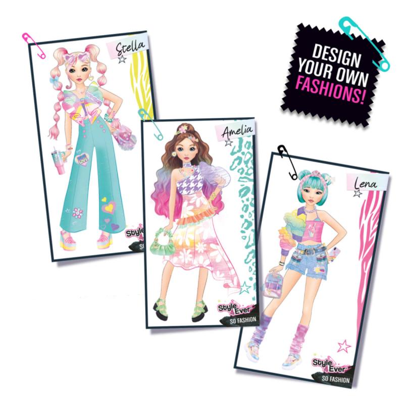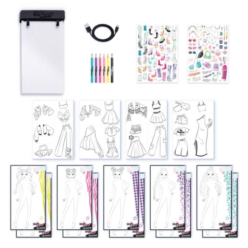V sadě je k dispozici podložka s podsvícením, šablony, 10 modelů, 2 archy nálepek a barevné tužky pro vytvoření jedinečných módních návrhů.