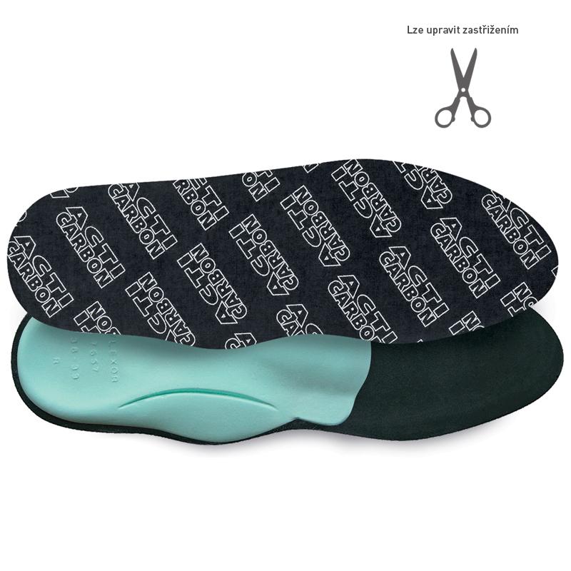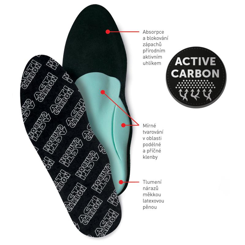 Tvarování vložky carbone zajišťuje latexový odlitek. Ten vytváří v patní části lůžko pro uložení paty, dále přechází v mírnou podporu podélné klenby. V přední části je srdíčko, které podepírá příčnou klenbu. Tento základ vložky překrývá latexová stélka obsahující aktivní uhlík, který vyniká vysokou savostí a omezuje šíření nežádoucích bakterií. Pro zvýšení hygienických vlastností je tato vrstva navíc laminovaná bavlněným textilem. Používají se v obuvi s nedostatečným vnitřním tvarováním a pro zvýšení komfortu chůze. Zobrazit celý popis