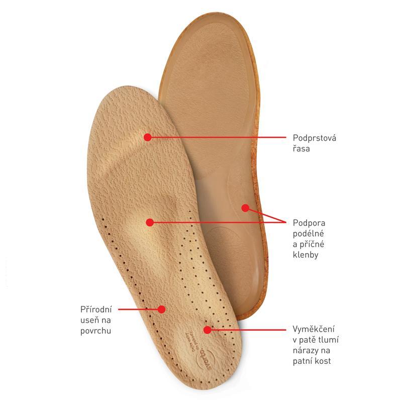 Základ vložky ortopedické tvoří pružný korkfant, který podepírá podélnou klenbu. Příčnou klenbu podepíra srdíčko, které je anatomicky tvarováno pro levou a pravou nohu, léčí příčné plochonoží 1. a 2. stupně a je prevencí při nadměrné zátěži nohou. Podprstová řasa a měkký polštářek v patě přispívají k pohodlné chůzi. Povrch je překryt jehněčí usní, která zvyšuje komfort a hygienické vlastnosti.Jaký problém produkt řeší? chybné postavení chodidel / propadlá klenba / příčně plochá noha / vybočená nebo vbočená pata / podélně plochá noha