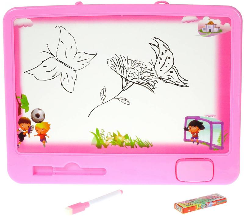 Oboustranná růžová plastová tabule o velikosti 39 x 30cm. Bílá strana pro psaní fixou, černá strana pro psaní křídami. Součástí houbička, fixa a bílé křídy.Kreslicí tabule přináší nové výzvy a spoustu zábavy. Skvělý způsob, jak relaxovat a rozvíjet svou kreativitu. Perfektní způsob, jak trávit volný čas a zklidnit se. Tabule inspiruje k tvorbě nových výtvarných děl každý den. Skvělý dárek pro každého, kdo má radost z tvoření.