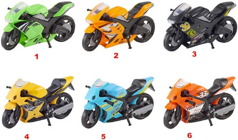 Rychlý motocykl z plastu v konbinaci s kovem v šesti barevných variantách, pro všechny malé motorkáře a závodníky. Baleno v krabičce.Rozměr balení (š v h): 16 x 8 x 5,5cm