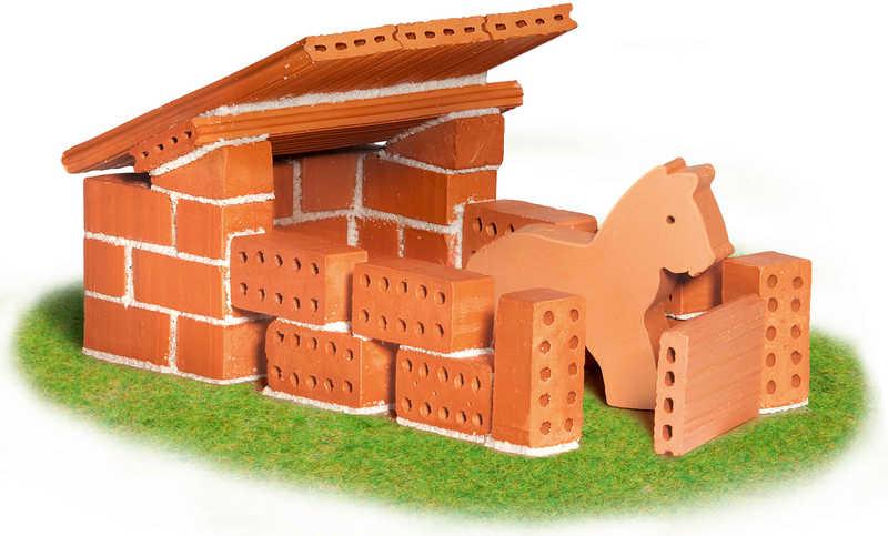 Stavebnice Domek Horses - stáj obsahuje: plánek na stavbu stáje, cihličky, pojivo (malta je směs jemného písku s kukuřičným