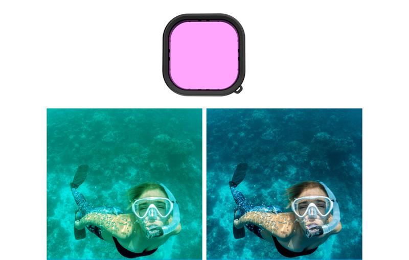 Růžový filtr využijete při potápění v moři v hloubce 5-25 m. Bude užitečný zejména pro milovníky šnorchlování. Pomáhá korigovat barevné odchylky a eliminuje modré zabarvení na fotografiích a videích.