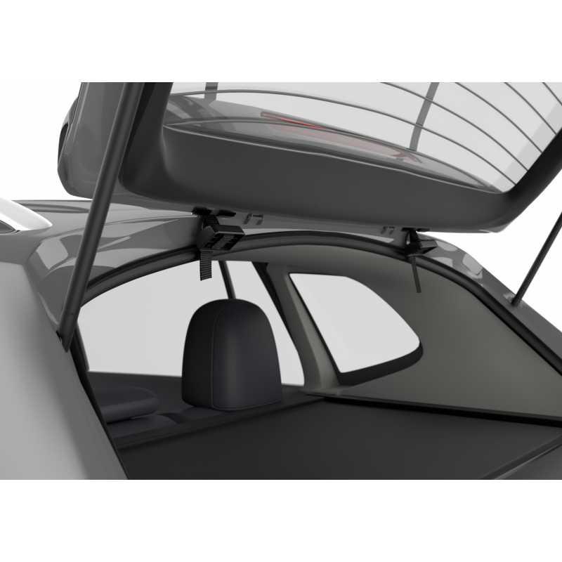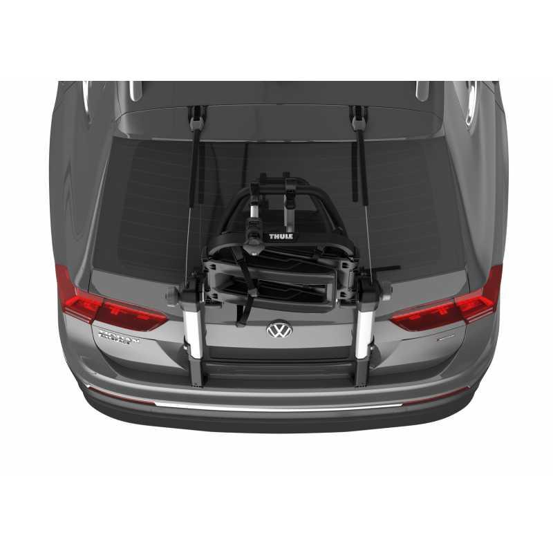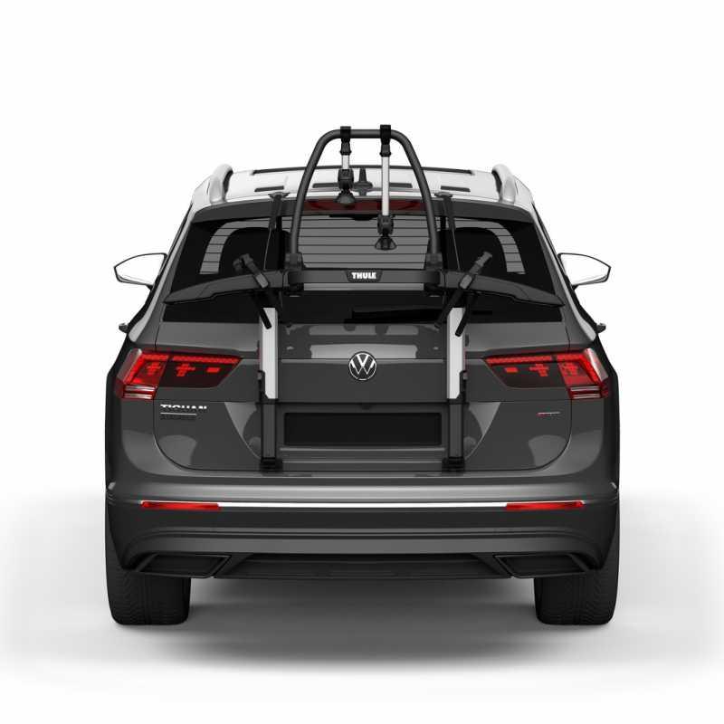 Nosič se připevňuje za horní a spodní hranu zadních dveří pomocí rychloupínacího systému s mechanismem omezujícím moment utažení, což zajišťuje pevné a bezpečné uchycení bez poškození vozu. Dvojité háky a pryžové ochranné podložky chrání lak vozidla. Kola se upevňují pomocí nastavitelných držáků a růžic s omezovačem utažení Thule AcuTight, který cvakne při optimálním dotažení. Popruhy s přezkami pevně fixují ráfky kol.