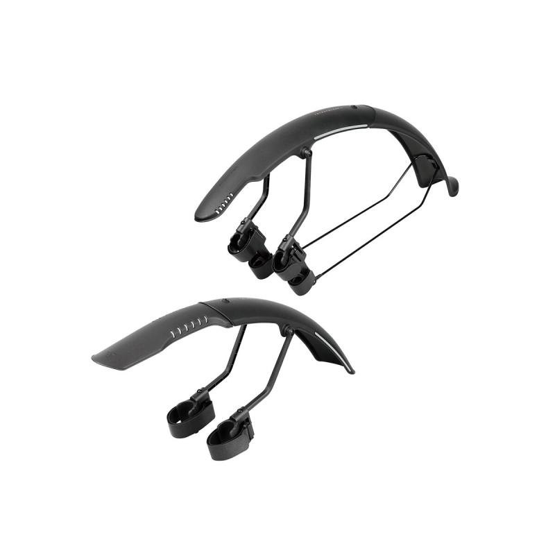 Predný a zadný dvojfarebný blatník s rýchlou, bezpečnou a jednoduchou montážou.Nastaviteľné vzpery zabezpečujú tesnejšie prilnutie k pneumatike a vynikajúcu ochranu pred blatom, zatiaľ čo vysoko leštená spodná strana pomáha predchádzať usadzovaniu nečistôt a uľahčuje čistenie. Priložené reflexné nálepky 3M zabezpečujú bezpečnosť v noci.