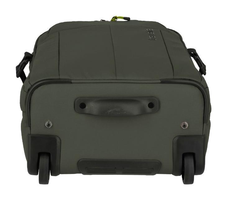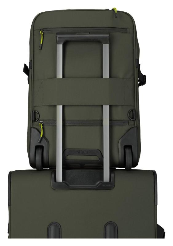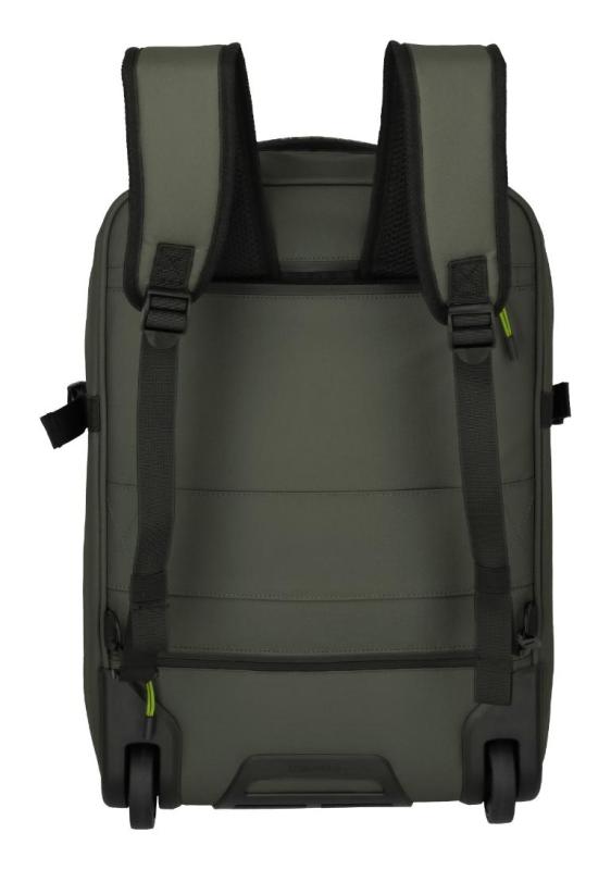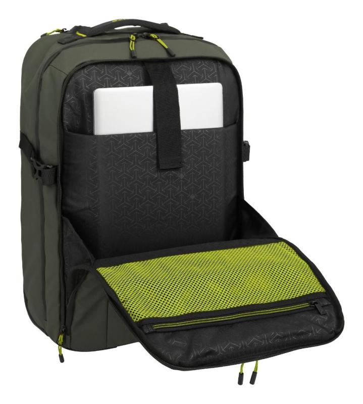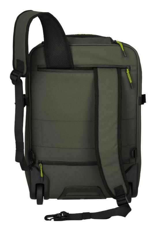 Vďaka nastaviteľným ramenným popruhom si ho môžete pohodlne prispôsobiť a v prípade potreby ich zasunúť do špeciálneho vrecka, čo oceníte pri preprave na kolieskach. Batoh je vybavený dvoma veľkými kolieskami, ktoré sú chránené integrovaným krytom, takže pri nosení na chrbte nedochádza k ich poškodeniu.