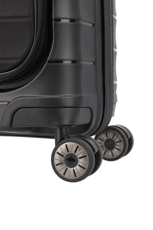 Čtyřkolečkový skořepinový palubní kufr z recyklovaného polypropylenu s výklopnou přední kapsou na notebook, organizérem, TSA zámkem a vodoodpudivým zipem.4 dvoukolečka otočná o 360° s tichým chodem