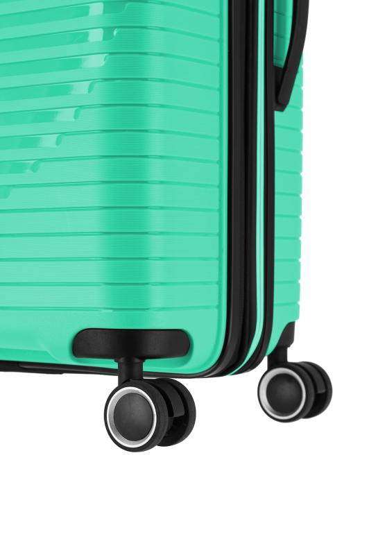 Štyrikolesový skořepinový palubný kufor z extra odolného polypropylénu vybavený integrovaným TSA zámkom.4 extra tiché dvojkolesá otočné o 360°