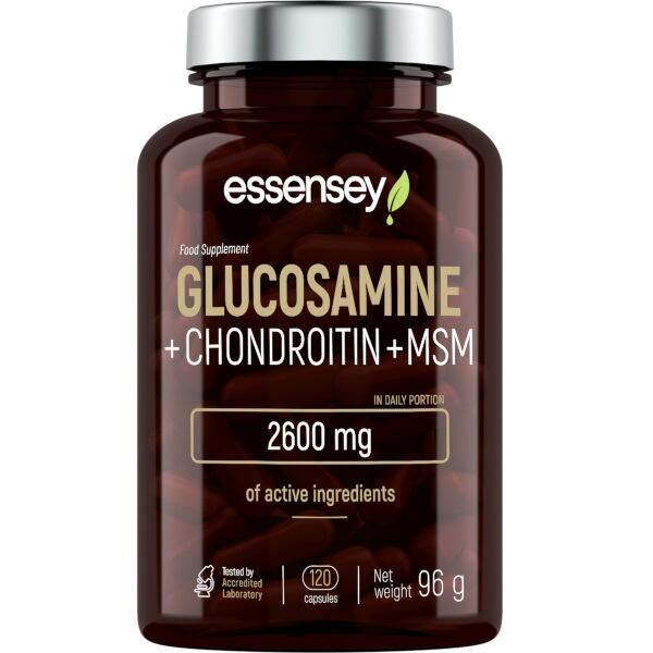 ESSENSEY GLUCOSAMINE + CHONDROITIN + MSM. Doplněk stravy. Přípravek v kapslích s obsahem glukosamin sulfátu, chondroitin sulfátu a methylsulfonylmethanu.
